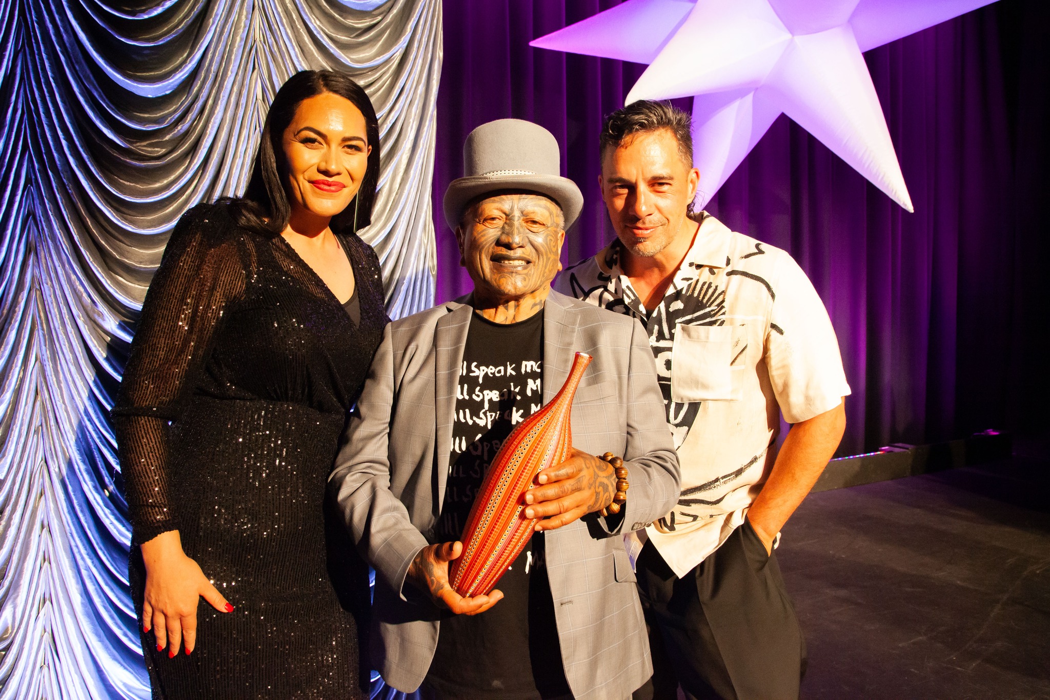 3. New Zealanders smiling about their film “Muru” winning the prized Cultural Diversity Award. They are, L to R – Roimata Fox, Tame Iti, and the director Tearepa Kahi.